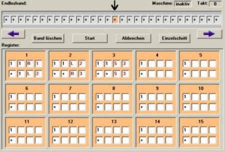 Die Turingmaschine ist ein typisches akademisches Spielzeug - überhaupt nicht verspielt, sondern grau in grau und kochentrocken. Der englische Mathematiker Alan Turing hat sie 1936 zur Untersuchung von Fragen der "Berechenbarkeit" entwickelt. Turing hat mit dieser Maschine die Zerlegung von Algorithmen in einfach Operationen bis an die Grenze getrieben - bis fast nichts mehr übrig blieb. Allerdings gelang es ihm damit herauszufinden, daß man alles, was man überhaupt berechnen kann, mit dieser Maschine berechnen kann. Die Maschine hat sich so als eines der mächtigsten Instrumente der Mathematik erwiesen.